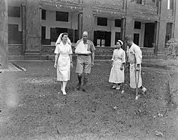 British and Japanese patients, accompanied by nurses, take exercise in the grounds of 81 Mobile Field Hospital.