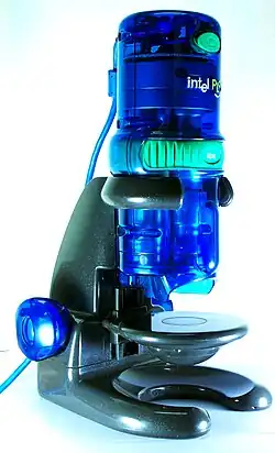 The QX3 Computer Microscope was a product in the Intel Play product line and was continued in the Digital Blue product line. An upgraded QX5 model was available.