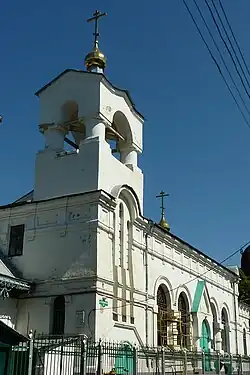 To extended dining room adjoins the semicircular apse, asymmetrically located one-tier belfry and porch. Belfry, refectory and the apse are crowned by small cupolas with crosses. Semicircular window openings of the refectory are decorated with decorative plaster. The temple is designed to hold about 500 worshipers.[1][3][4]