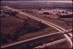 I-271 does not have a direct interchange with I-80/Ohio Turnpike—one of only a few examples of Interstate Highways that cross but do not intersect. The I-271/I-480 section was the only instance of a concurrency of two three-digit Interstate Highways in the nation until 2022, when a concurrency between I-587 and I-795, and I-840 and I-785 in North Carolina was established with the designation of I-587, I-785, and I-840.[2] This is because I-80 was concurrent with I-271 until 1971, when I-80 was routed back on to the turnpike and replaced by I-480.