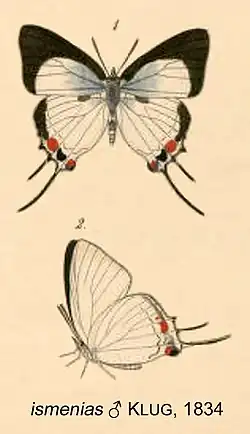 Iolaus ismenias, the white sapphire, is a butterfly in the family Lycaenidae. It is found in Senegal, Guinea-Bissau, Burkina Faso, Ivory Coast, Ghana, Togo, Nigeria, Cameroon, the Democratic Republic of the Congo, Sudan, Uganda and Ethiopia.[2] The habitat consists of dry savanna.
