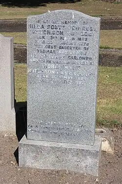 87. ^ "Jeanie Wylie Hutchison grave monument details at Municipal Cemetery, Kirkliston, West Lothian,Scotland". www.gravestonephotos.com. Retrieved 17 April 2022.