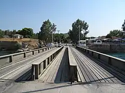To the west of the Isthmus is the Gulf of Corinth, and to the east the Saronic Gulf. Since 1893 the Corinth Canal has run through the isthmus, effectively making the Peloponnese an island. Today, two road bridges, two railway bridges and two submersible bridges at both ends of the canal connect the mainland side of the isthmus with the Peloponnese side. Also a military emergency bridge is located at the west end of the canal.