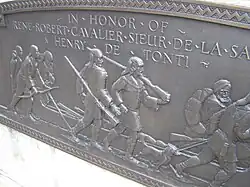 Bronze dedication on a southwest tower of the DuSable Bridge, Chicago, Ill. "In honor of René-Robert Cavelier, Sieur de La Salle & Enrico Tonti." Enrico Tonti founded the first European settlement in Illinois in 1679, and in Arkansas in 1683, making him "The Father of Arkansas".[1][2] He co-founded New Orleans