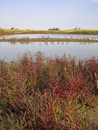 The dominant vegetation on the Kinburn Spit are those of sandy steppe, with forest, meadow, hygrophylic and halophytic plant groups. Amid the grassy areas are stands of pine–oak forest, and marshes. Yahorlyk Bay to the south of the Kinburn Spit is a Ramsar wetland site.[5]