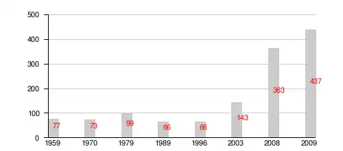 | Year | 1959 | 1970 | 1979 | 1989 | 1996 | 2003 | 2008 | 2009 |