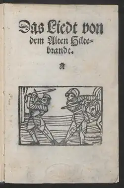 The textual form of the Jüngeres Hildebrandslied is a product of the fifteenth century, though its material is clearly much older (see below).[3] It is transmitted in five manuscripts, beginning with a fragment from 1459, with the first complete version found in the Dresdener Heldenbuch. The poem was printed numerous times beginning in the sixteenth century, and continued to be printed into the eighteenth century. The ballad even ended up in the collection of German folk poetry known as Des Knaben Wunderhorn (1805).[4] The poem and the melody to which it was sung were both extremely well known throughout this period.[2]