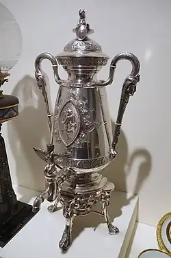 Urn with Egyptian figures, part of a six-piece tea and coffee service, J.E. Caldwell & Company, Philadelphia, c. 1875