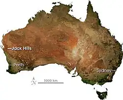 The Jack Hills are a range of hills in Mid West Western Australia. They are best known as the source of the oldest material of terrestrial origin found to date: Hadean zircons that formed around 4.404 billion years ago. These zircons have enabled deeper research into the conditions on Earth in the Hadean eon. Potentially biogenic carbon isotope ratios have been identified for graphite embedded within a 4.1 billion-year-old zircon from the site.[1][2]