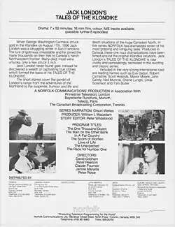 This series of seven 52 minute 16mm colour films [2] made for television episodes featured dramatised versions of Jack London's works, narrated by Orson Welles.[3] and included in the international cast Eva Gabor, John Candy, Robert Carradine, Scott Hylands, Cherie Lunghi, Mavor Moore, Neil Munro, John Ireland, Linda Sorenson and Tom Butler.
