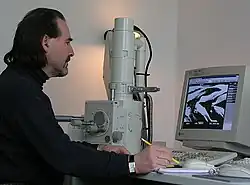 Jack Ogden examining Roman copper alloy chain with a scanning electron microscope.
