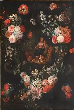 Garland paintings were usually collaborations between a still life painter who painted the garland and a figure painter who filled the central cartouche with an image. The cartouche in the center of Caproens's garland paintings is filled with religious as well as mythological imagery. A pair of garland paintings entitled Cartouche still life of flowers around an image of Caritas and Cartouche still life of flowers around a bacchanal of putti (Town hall of Braunlage) have respectively a religious and secular cartouche.[5]