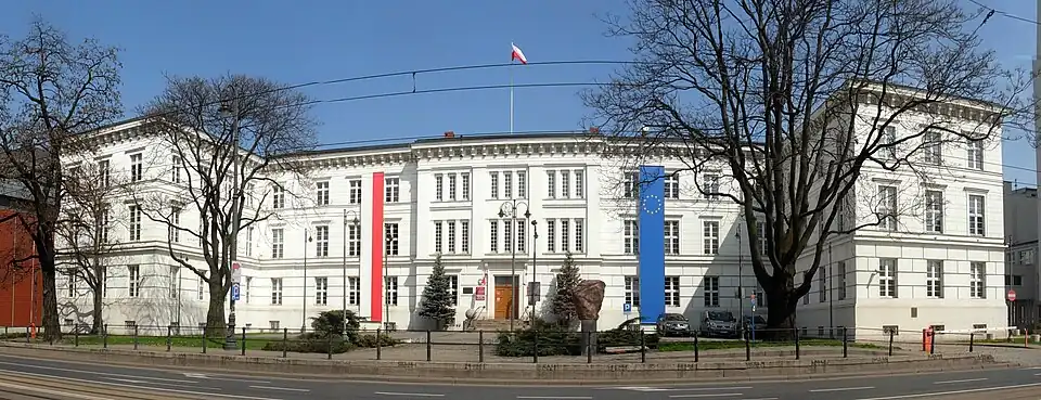In the years 1863–64, the building was extended by two small avant-corps on each side. In 1898–1900, the edifice was partially reconstructed and added four wing in the corners, under the supervision of Mr Busse, a national project building inspector.[15] Originally in the basement were located the housing and laundry services, the lithography facility and the fuel storage. On the ground floor were set bureaus, offices, the cadastre district department and the finance branch. On the first floor, in addition to the presidential salon, there were a reading room, a library and a conference room. School, tax and forestry departments were housed on the second floor and in the attic.[14] When Bydgoszcz joined back Polish territory in 1920, Prussian administration was liquidated, the now disused building housed, among others, the Regional Directorate of State Forests, the Accounting Chamber of Control of the Ministry of Posts and Telegraphs, the Regional Tax Office, the county School Inspectorate and the Inspectorate of Labour. In 1938, Bydgoszcz city became the capital of Pomeranian Voivodeship and the building housed its administrative services. During the Nazi occupation, German authorities reactivated Bydgoszcz "Rejencja" within the District of Gdańsk-West Prussia and used the edifice accordingly. After the liberation of Bydgoszcz in March 1945, the building was constantly the provincial seat of the Polish authorities. From 1945 to 1950, it housed the Bydgoszcz Voivodeship, between 1950 and 1975 the Provincial Bureau of National Council, from 1975 to 1998 the Provincial Office and the Local assembly of the Bydgoszcz Province. Since the administrative reform of 1999, it is the seat of Kuyavian-Pomeranian Voivodeship. In the 1960s, the construction was expanded with side-buildings, connected by a pedestrian covered bridge:[15]