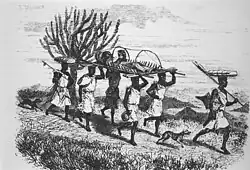 - (pages 189–90): On our journey, the stretcher was changed from head to the shoulder of the Waganda, who went at the rate of six miles an hour, jostling and paining my limb unmercifully. The coach and four, as I may term it, was put down every mile, or less, that the bearers might rest, laugh, joke, .... One great difficulty was to make them carry the conveyance so that the country in front could be seen in travelling; this they, for some reason, refused to do, and persisted in carrying me head first, instead of feet (fig 1-10).