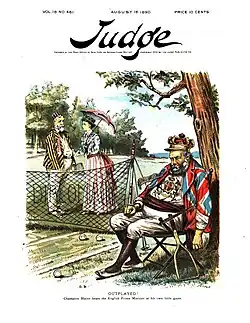 Opinion swiftly turned against Blaine. The June 3 The New York Times carried the headline "Blaine's Nomination Now Out of the Question." Blaine took his case to the House floor on June 5, theatrically proclaiming his innocence and calling the investigation a partisan attack by Southern Democrats in revenge for his exclusion of Jefferson Davis from the amnesty bill of the previous year.[65] He read selected passages from the letters aloud and said, "Thank God Almighty, I am not afraid to show them!" Blaine even succeeded in extracting an apology from the committee chairman. The political tide turned anew in Blaine's favor, but the pressure had begun to affect Blaine's health, and he collapsed while leaving church services on June 14.[66] His opponents called the collapse a political stunt, with one Democratic newspaper reporting the event as "Blaine Feigns a Faint." Rumors of Blaine's ill health, combined with the lack of hard evidence against him, garnered him sympathy among Republicans and, when the Republican convention began in Cincinnati later that month, he was again seen as the frontrunner.[67]