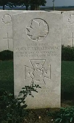 In 1916, the 1st Canadian Division were involved in fighting several episodes of the Battle of the Somme. On 8 October 1916, in a phase of the action known as the Battle of the Ancre Heights Richardson's battalion was pinned down by barbed wire barriers and intense enemy fire during an attack on Regina Trench. The 20-year-old fearlessly encouraged his comrades forward by marching in front of them, playing his bagpipes in the face of the withering enemy fire, inspiring them to get up and continue their attack, which was ultimately successful. Later in the day, James realized he had left his bagpipes at or near the front lines and decided to traverse the battlefield to recover them, however, Richardson never returned and was presumed to have been killed.