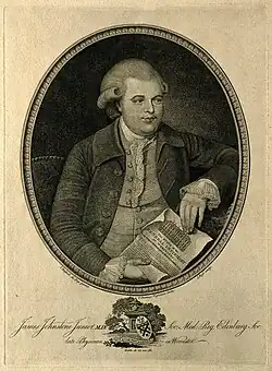 James Johnstone the younger (1754–1783), physician, the eldest son, born at Kidderminster in August 1754, commenced in 1770 the study of medicine at Edinburgh. Upon being admitted a member of the Medical Society of Edinburgh he distinguished himself by his papers and in the debates, and was honourably noticed by his professors, particularly by Dr. Cullen and Dr. Gregory; to the last he acted as clinical clerk in preparing cases for the lectures at the infirmary. He graduated M.D. at Edinburgh in September 1773. His thesis, ‘De Angina Maligna,’ was recommended to the attention of physicians by Dr. Cullen. It was republished at Worcester in 1779 in an English translation, with considerable additions and some remarks on the angina trachealis. In the summer of 1774 Johnstone was chosen physician to the Worcester Infirmary. When called upon by the county magistrates to visit the prisons where many laboured under gaol fever, he cheerfully undertook the task, but caught the infection and died on 16 August 1783.