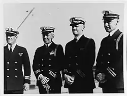 Commissioning ceremony of destroyer USS McCall at Mare Island Navy Yard in June 1938. Kauffman (left) with Rear Admiral David W. Bagley (center), Commandant of the Yard and Lieutenant Commander John Whelchel, commanding officer of McCall.