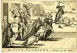 Satirical print from 1773 about the schism in the Wilkesite group. Townsend is upper right whipping the girl with sticks: a story to this effect had been publicised by Wilkes, though in reality it was two six-year-olds.[3] The bull stands for Frederick Bull.