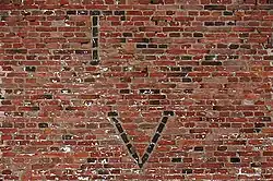The truly principal feature of this gable, however, are die initials "T" and "I V H" worked in the masonry in black clinker brick headers. These are the monograms of the first occupants of the house, Jan van Hoesen (1687–1745) and his wife Tanneke. The "T" stands for Tanneke, given name of the wife of Jan Van Hoesen, Tanneke Wittbeck. The letters "V" and "H" stand for Jan's family name Van Hoesen. Jan's given name is represented by the letter "I", which is the Dutch representation of the letter "J".[2]