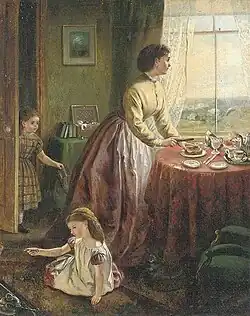 An example of Bowkett's work which has been subject to feminist interpretation is Preparing Tea (or Time for tea as it had been retitled when sold for £2000 at Christie's South Kensington on 16 March 2011). This painting shows a woman, presumably a wife and mother, spreading jam on toast as she gazes out the window while one of her children is toasting bread by a fire and the other child is carrying a pair of men's slippers.[16][17][18] It has been suggested that Bowkett leaves some ambiguity in the facial expression of the mother as she sees her husband's train approaching in the distance.[19] And that this piece depicted the ability of women and children alike to be happy without having to rely on a male presence.[3] This critic also suggests that Bowkett's work combined concepts of everyday life, idealized domestic scenes, and ideals of motherhood in which she refused to depict women as being models of domestic virtue. This interpretation is suggested to be demonstrated in some of her other works where Bowkett depicts women bothering themselves with their home duties and not fulfilling expectations that were set for them. The critic concludes that by disrupting the interaction between form and content, Bowkett is able to leave moral ambiguity in her work.[3] Comparing Bowkett's ‘Preparing Tea’ with her similar painting ‘Looking out for Papa’ tends to argue against a consistent ambiguity in her work suggested by the critic. The latter painting's title and content seems to indicate an unambiguous welcome for the imminent arrival of ‘Papa’.