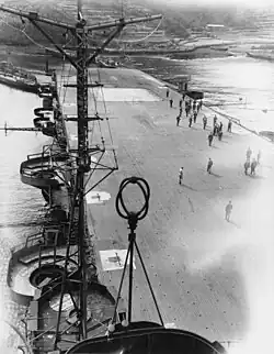 Hiyō spent November in Truk before returning in early December to Japan, where she was rejoined by the rest of her air group. Aside from a brief refit at Kure from 26 February to 4 March 1943 that saw her anti-aircraft armament augmented and an additional radar installed, the ship was training in the Inland Sea until she sailed for Truk on 22 March.[14] Her air group consisted of 27 Zeros and 12 D3As, and they were detached from Hiyō in early April to participate in Operation I-Go, a land-based aerial offensive against Allied bases in the Solomon Islands and New Guinea. On 7 April her aircraft formed most of the third wave of attacks on Guadalcanal. Escorted by 24 Zeros from Hiyō and another 6 from the light carrier Zuihō, the D3As attacked shipping in the Sealark Channel. The escorts claimed to have shot down three American aircraft for the loss of one Zero and three dive bombers.[17] Allied naval losses during the entire day included Aaron Ward, the oil tanker Kanawha, the minesweeper HMNZS Moa and damage to a transport and another tanker, although it is uncertain which aircraft sank or damaged each ship.[18]