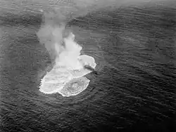 A Japanese destroyer under attack off Fukushima, Hokkaido, on 14 July 1945, probably either Tachibana or Yanagi which was heavily damaged in the same area
