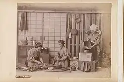 The Japanese kitchen (Japanese: 台所, romanizedDaidokoro, lit.'kitchen') is the place where food is prepared in a Japanese house. Until the Meiji era, a kitchen was also called kamado (かまど; lit. stove)[1] and there are many sayings in the Japanese language that involve kamado as it was considered the symbol of a house. The term could even be used to mean "family" or "household" (much as "hearth" does in English). Separating a family was called kamado wo wakeru, or "divide the stove". Kamado wo yaburu (lit. "break the stove") means that the family was broken.