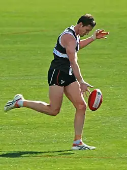 Jason Blake (born 15 March 1981) is a former Australian rules footballer for the St Kilda Football Club in the Australian Football League (AFL). An "undersized tall defender and occasional ruckman",[1] he held the record for the most games played (209) without receiving any Brownlow Medal votes until he eventually received two Brownlow votes for Round 11 in 2012. The record was subsequently beaten by Nick Smith.[2]