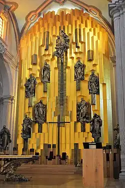 A collaboration with Ricardo Leogorreta in which the two won a contest for a redesign proposal for the interior of Zacatecas. Made with Bronze, wood and gold leaf, the piece has 12 choir chairs and the 12 apostles depicted in a prismatic orientation.[17] This piece is seen as one of his more noteworthy works.[18]