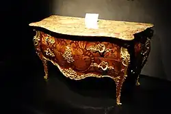 In May 1736 Latz was naturalized as a French citizen.[13] In 1741 he was appointed ébéniste privilegié du Roi,[14] a court appointment under royal warrant that should have freed him from certain Parisian guild restrictions. Robust and sculptural gilt-bronze mounts that show technical virtuosity in casting and the chasing of their surfaces are a consistent feature of Latz' identified work, and in this vein Henry Hawley has noted that he was investigated in December 1749 by the Paris guild of workers in metal (Communauté des fondeurs), for casting and chasing mounts in his own workshop, a privilege that was normally reserved to the metalworkers' guild.[15] In spite of his warrant as ébéniste privilegié, all his bronze-chasing tools were confiscated and, what must have been an overwhelming loss, a thousand models for bronze mounts.[16] Some of his furniture mounts can be dated 1745-49 by the tiny "crowned c" tax stamp they bear, that was in effect only during those years; an example is Latz' commode in the Cincinnati Art Museum.[17]