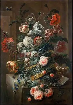 His 'garland paintings' go back on a genre of flower representation invented in early 17th century Antwerp by Jan Brueghel the Elder. The genre was subsequently practised by leading Flemish still life painters, such as Daniel Seghers. Paintings in this genre typically show a flower or, less frequently, fruit garland around a devotional image or portrait. In the later development of the genre, the devotional image was replaced by other subjects such as portraits, mythological subjects and allegorical scenes.[6][7]