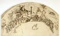 Before La Silhouette closed, Charles Philipon and Auguste Audibert founded La Caricature in 1830, with Honoré de Balzac as a literary editor and Grandville, Achille Devéria, Honoré Daumier, Edme Jean Pigal, Auguste Raffet, and Charles-Joseph Traviès de Villers as cartoonist and lithographers.[8] As one author put it "From 1830 to 1835 Philipon and La Caricature waged all-out war against Louis-Philippe."[1] As part of this "war" Grandville designed numerous prints, including multi-part lithographs published over a period of weeks that collectors could piece together into one, e.g. the seven part Grande Croisade contre la Liberté (The Great Crusade Against Liberty) and La Chasse à la Liberté (The Hunters in Pursuit of Liberty). These attacks on monarchy were taken seriously and were not without consequences. Louis Philippe's regime seized papers, levied fines, and sent editors, writers, and illustrators to prison. Daumier was fined 500 francs and spent six months in prison in 1832. Charles Philipon received even greater fines and longer prison terms as did other publishers. Grandville endured persistent harassment from the police, including searches, and one incident described as a mugging in his own building by thuggish policemen, foiled by a neighbor who confronted them with pistols. He is said to have been deeply distressed by these events. Grandville filed criminal charges asserting the police had entered his residence by force, and he later published a lithograph Oh!! Les vilaines mouches!!(Oh!! These nasty flies!! ) Philipon organized L'Association Mensuelle lithographique which offered fine prints to its members in the early 1830s. Grandville produced over half the prints, with the profits going to pay the paper's fines.[1][5]