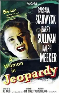 Jeopardy is a 1953 American crime drama directed by John Sturges. The black-and-white film stars Barbara Stanwyck and Barry Sullivan as a married couple, and Ralph Meeker as an escaped convict. The film was based on the 22-minute radio play "A Question of Time".[4]