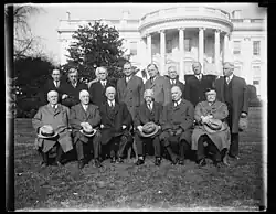 Railway executives meet with Hoover. Front row, left to right: Agnew T. Dice, Pres. Phila. and Reading R.R.; Richard Aishton, President American Railway Association; Secretary of Commerce Lamont; Secretary of the Treasury Mellen, Hale Holden, Chairman Southern Pacific R.R. and L.F. Loree, President of the Delaware and Hudson. Back row, left to right: Jeremiah Milbank, Southern Railway, J.J. Bernet, President Chesapeake and Ohio; P.E. Crowley, President New York Central Lines, J.J. Pelley (hiding face) New York, New Haven and Hartford, Fairfax Harrison, President Southern Railway.