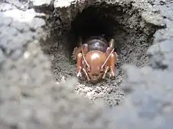 No species have wings with sound-producing structures; moreover, evidently none has structures it could use to hear sound.[4][5] This contrasts with true crickets and katydids, which use their wings to produce sounds and have hearing organs to sense sounds of others. Jerusalem crickets seem unable to hiss by forcing air through their spiracles, as some beetles and cockroaches do. Instead, the few Jerusalem crickets that do make sound rub their hind legs against the sides of the abdomen, producing a rasping, hissing noise.[6] This hiss may serve to deter predators rather than to communicate with other crickets. For such purposes, Jerusalem crickets rely on substrate vibrations felt by subgenual organs located in all six of the insect's legs.[7]