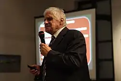 After 1989 Vetulani politically sympathized with the center and the left. He has publicly supported specific candidats for public offices. In the 2010 presidential election in both rounds he supported Bronisław Komorowski[35] and in the parliamentary election a year later Józef Lassota. In 2014 European Parliament election he supported Jan Hartman, expressing at the same time his solidarity with Róża Thun.[36] Prior to the first round of presidential election in 2015, he supported Janusz Palikot.[37] In the same year, in the parliamentary election he again supperted Lassota's candidature, congratulating him after obtaining a seat in the Sejm.[38]