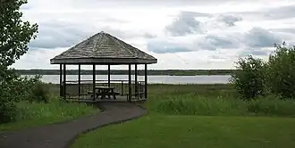 The lake hosts thousands of ducks, Canada geese, American coots, blackbirds and other bird species throughout the period from April through October. Muskrats are often seen. Shooting is prohibited. The trail roughly follows the shore passing two tall lookout towers and four lookout platforms. Green algae covers large parts of the lake and reeds and marsh constitute much of the shore. A small low wooded island is found in the centre. It's very common that, at the beginning of both summer and fall, the paths will overflow with water and thus non-traversable.