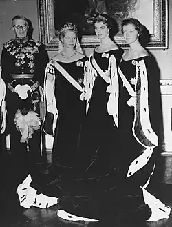 (L–R) Gustaf VI Adolf, Princess Sibylla, wearing the Connaught Diamond Tiara with the Vasa Earrings and the Bernadotte Emerald Demi-Parure, Princess Margaretha, wearing Queen Louise's Diamond Tiara, and Princess Birgitta at the opening of the Riksdag, 1956