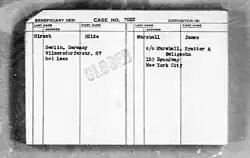 ![]() A Transmigration Bureau deposit card, case no. 7022, showing a beneficiary named Hilde Hirsch, of Berlin, and Depositor James Marshall, of New York City. | |