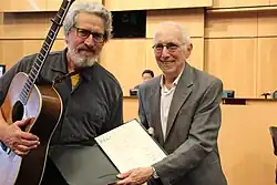 Seattle City Council member Nick Licata presents Page with a formal proclamation honoring the 40th anniversary of the Council's legalization of street music, in which Page played a key role.