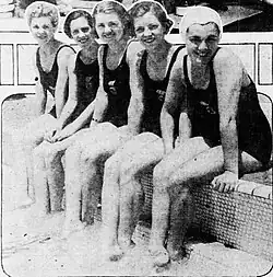 ![]() Swimmers from Boston during try-outs for the 1932 Summer Olympics, (left to right) Joan McSheehy, Susan Robertson, Louisa Lindstorm, Catherine Ames and Eleanor Holm[1] | |