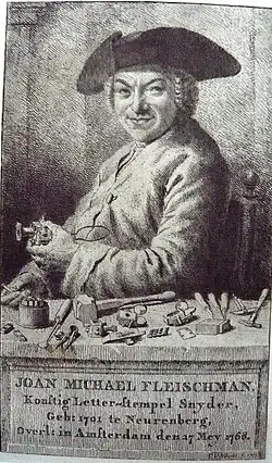 2. ^ a b "Aanmerkelyke Zaken". Maandelijkse Nederlandsche Mercurius. 1768. Retrieved 4 June 2020. The 27th of [May 1768] in Amsterdam, Mr. Joan Michaël Fleischman died, born in Neuremberg, at the age of about 67 years, who was in life the most skilled punchcutter that has ever been in the world since the invention of the printing press.