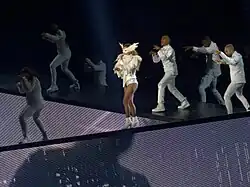 Like on the singer's previous tours, the show was divided into separate segments, each preceded by a costume change of the singer. While Gaga had not shared any sketches or details concerning the costumes before the tour began, it was reported that nearly 50,000 Swarovski crystals had been used while designing the costumes and props for Gaga and the dancers.[26] Sarah Tanno, who worked as makeup artist for the tour, has revealed that the crystals were even used on Gaga's eyes "in order to create a multi-dimensional effect that shines on stage".[27] Gaga shared a photo on Instagram prior to the first show, giving a preview of her two-toned, orange and green wig that she later wore for the shows.[28]