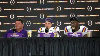 Burrow (center) with LSU head coach Ed Orgeron (left) and linebacker Patrick Queen (right) at LSU's 2020 National Championship post-game press event