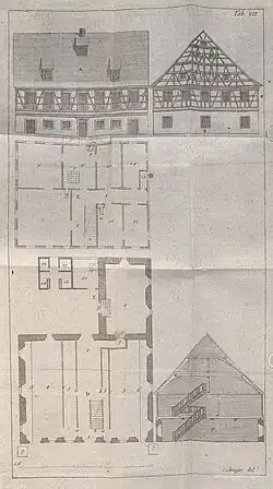 The 1773 textbook on husbandry, entitled Lehrbuch für die Land- und Haußwirthe in der pragmatischen Geschichte der gesamten Land- und Haußwirthschafft des Hohenlohe Schillingsfürstischen Amtes Kupferzell, described the agriculture and other customs in the Hohenlohe region of the Germany.[11] Mayer among others presented plans for a new farm house, the so-called "Pfarrer-Mayer-Häuser", in which the rural residential area and the barn were under one roof. The barn, located on the ground floor, would heat the living room on the first floor.