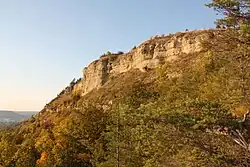 Paul Grimm and Hansjürgen Brachmann, on the other hand, saw this as a Frankish foundation.[24] Reinhard Spehr, in 1994 and 1997, has spoken out most clearly in favor of the assumption of a late Frankish foundation with far-reaching conclusions. According to him, "the Franks built a castle with stone wall facades to secure the imperial border in the 8th century."[25] Against the "view presented again and quite apodictically by Spehr" Matthias Rupp again turned in 1995. Although he spoke of a "fortification on the Johannisberg which so far does not allow an unambiguous ethnic classification", he gave arguments against a Carolingian border castle with the parallels in Slavic castle construction, Slavic pottery and the strategic orientation of the fortification on the high plateau of the eastern bank of the Saale.[26] In 2002, Peter Sachenbacher counted Johannisberg among the "castles which, at the time of their construction, are to be addressed as purely Slavic in terms of their ethnos."[27] Four years later, he stated, "Today, it is correctly assumed that the predominance of Slavic pottery does not automatically suggest a Slavic castle, and that it is quite more likely that the complex was built under Carolingian rule."[28]
