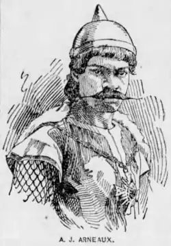 Arneaux started in vaudeville. His first appearance on a major stage was in 1876, when he played Tom Walcott, a Southern Planter, in John S. Ladue's "Under the Yoke, or Bond and Free" at the Third Avenue theatre in New York. He did not immediately pursue a career in acting, but worked for a time as a waiter and also as a barber. In 1883, he published a song, "Jumbo, the Elephant King!".[3] In 1884, at the urging of a theatre manager, he took the role of Iago in Othello at the Brooklyn Athenaeum, for which he received strong praise.[2] This production was organized by Benjamin J. Ford, who had success at the New York City Lyric Theatre in 1878 as the lead of an all-black cast production of Richard III. Ford played the role of Othello, Alice Brooks played Desdemona, Marie Lavere as Emilia, B. C. Devreaux as Michael Cassio, and R. R. Cranvell as Brabantio. The group then formed what was perhaps the first Shakespearean troupe of black actors which became known as the Astor Place Tragedy company. The company was managed by Arneaux and presented plays throughout New York City; its most prominent stage was in November 1884 at the Academy of Music where it presented John Banim's Damon and Pythias, with Arneaux as Damon and Ford as Pythias. John Ladue, Henrietta Vinton Davis, and Belle Martin were also in the production.[4]