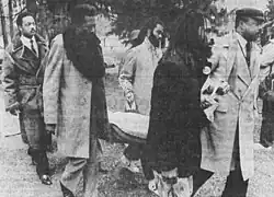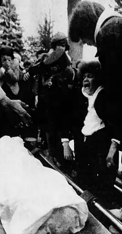 Africa's sister Louise James being helped away from a cloth-covered board containing his remains
