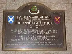 Memorial to John Arthur placed in the Church of the Torch, Kikuyu